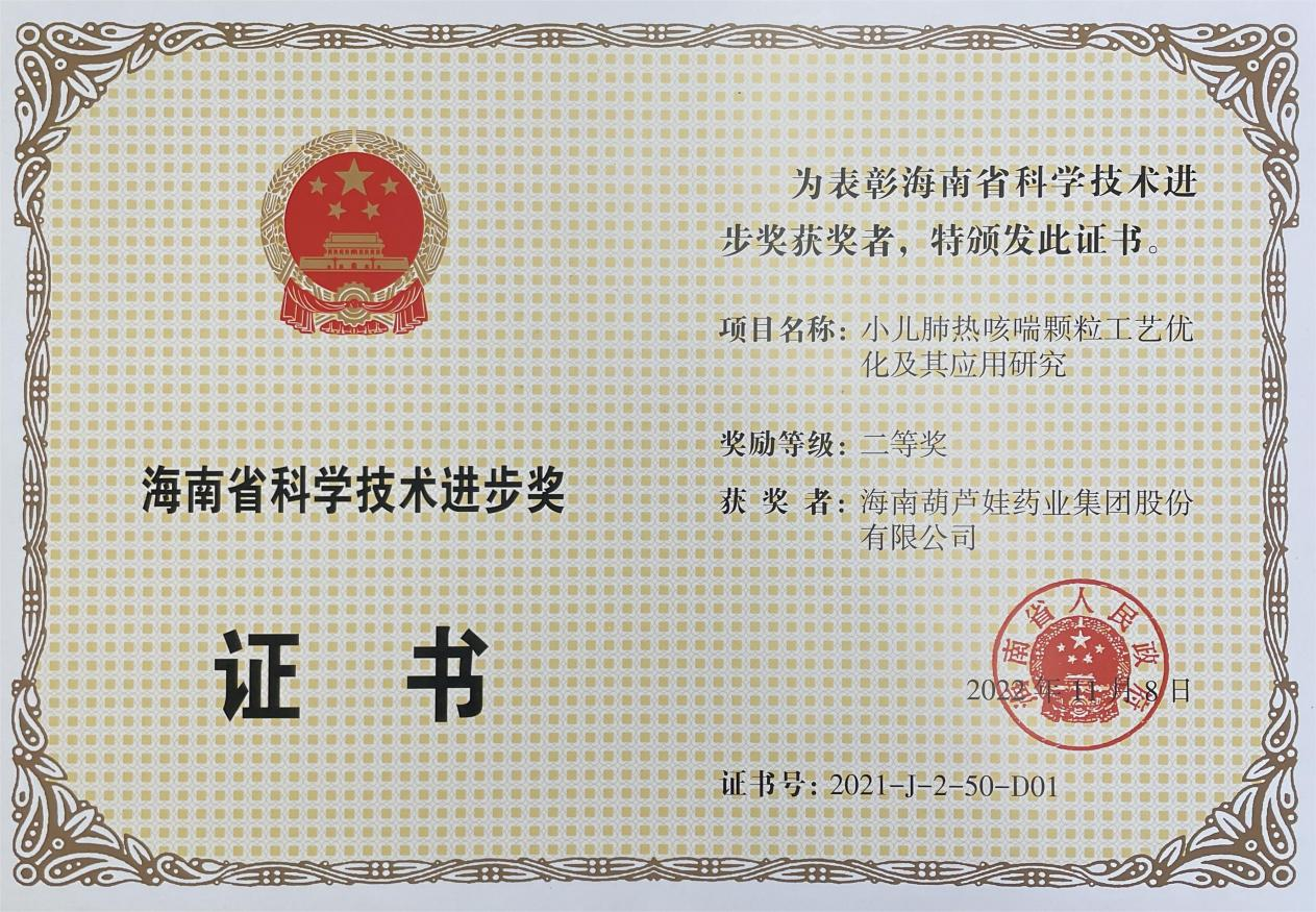 为此,小儿肺热咳喘颗粒的制备方法获得了第二十一届中国专利优秀奖(2019年),专利申请号:ZL201010134951,此次作为专利技术的应用,获得了2021年度海南省科学技术进步奖二等奖。在此之前,918博天堂牌小儿肺热咳喘颗粒还多次被授予“临床价值中成药品牌”、“中国连锁药店最具合作价值单品”,荣登“中国医药品牌榜”。